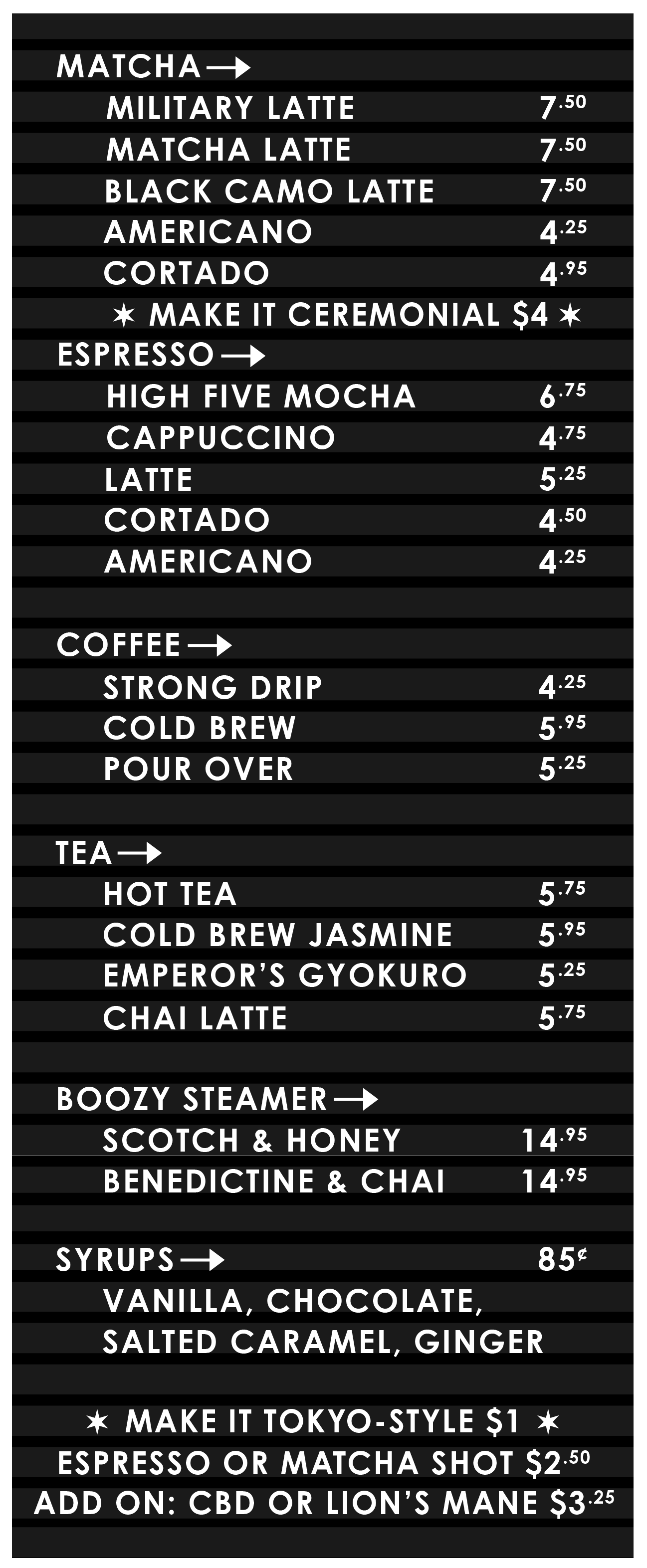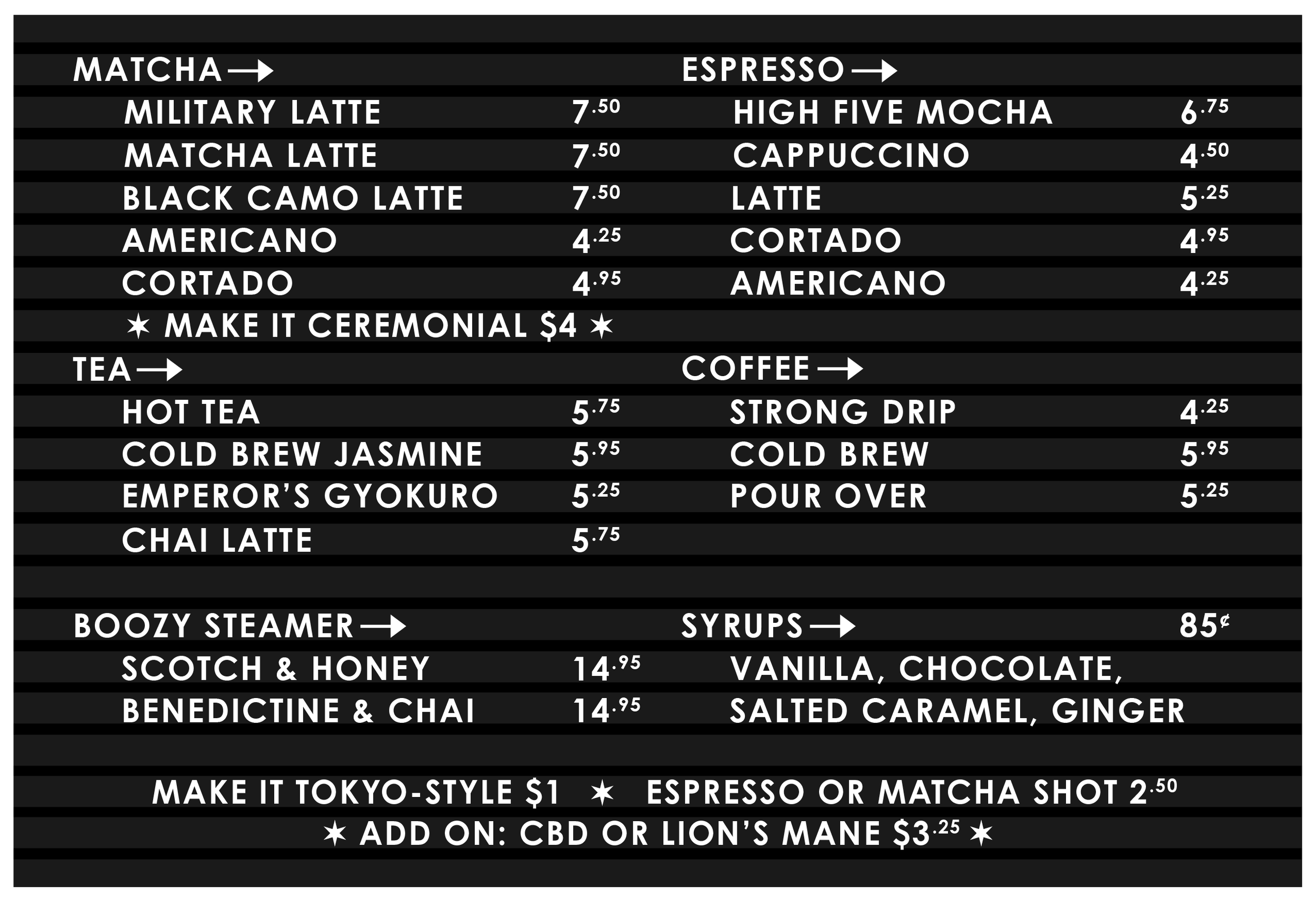 Make it Tokyo-Style $1 • Espresso or Matcha Shot $1.50